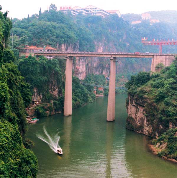 宜昌下牢溪大橋位于風(fēng)光秀麗的宜昌三游洞風(fēng)景區(qū)。該橋飛跨陡崖,拔地而起,橢圓型墩柱高達(dá)63米,1972年建成