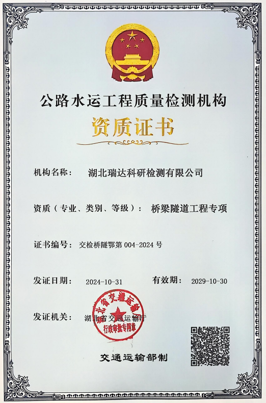 經(jīng)湖北省交通運(yùn)輸廳批準(zhǔn),湖北路橋瑞達(dá)科研檢測(cè)公司成功取得公路工程橋梁隧道工程專項(xiàng)資質(zhì),成為全省第5家取得該資質(zhì)的檢測(cè)機(jī)構(gòu),資質(zhì)實(shí)力達(dá)到了新高度。