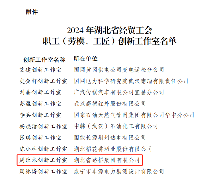 近日,湖北省經(jīng)貿(mào)工會(huì)印發(fā)了《關(guān)于 2024年湖北省經(jīng)貿(mào)工會(huì)職工(勞模、工匠)創(chuàng)新工作室建設(shè)結(jié)果的通報(bào)》,湖北路橋“周樂(lè)木創(chuàng)新工作室”獲評(píng)“湖北省經(jīng)貿(mào)工會(huì)職工創(chuàng)新工作室”。