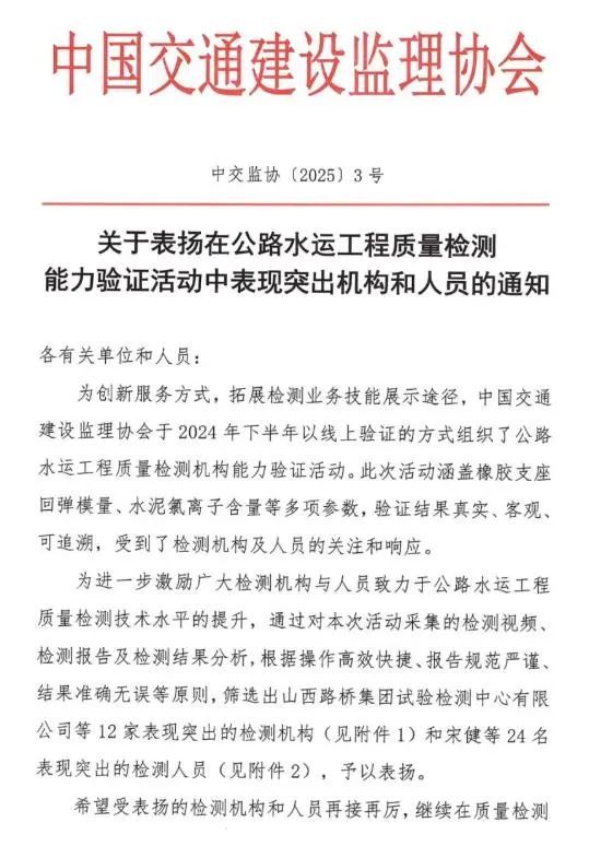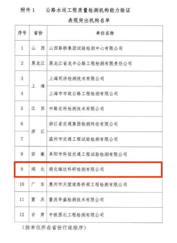 1月9日,中國交通建設監(jiān)理協(xié)會發(fā)布表彰通知,瑞達科研檢測公司成功蟬聯(lián)第二屆公路水運工程質量檢測能力驗證“表現(xiàn)突出機構” 榮譽,是全省唯一一家連續(xù)兩屆獲此榮譽的檢測機構。