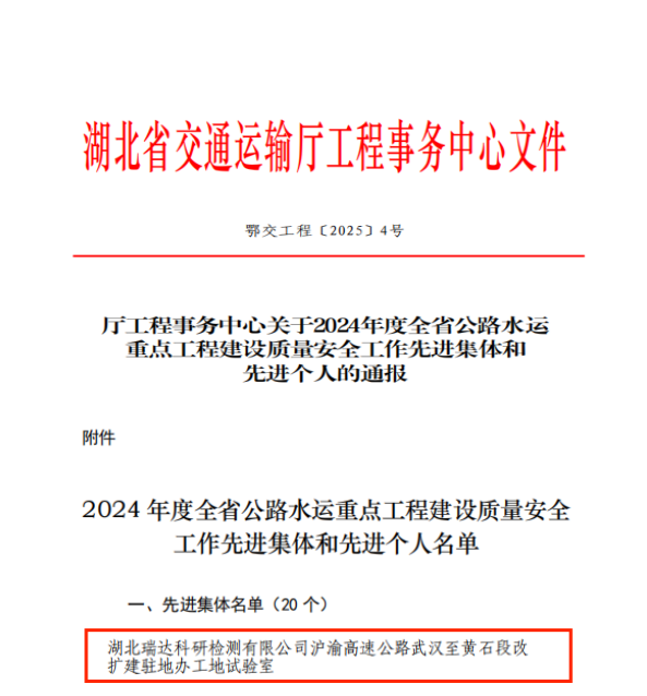 近日,湖北省交通運(yùn)輸廳工程事務(wù)中心發(fā)布了《關(guān)于2024年度全省公路水運(yùn)重點(diǎn)工程建設(shè)質(zhì)量安全工作先進(jìn)集體和先進(jìn)個(gè)人的通報(bào)》,瑞達(dá)科研檢測(cè)公司武黃改擴(kuò)建高速公路駐地辦工地試驗(yàn)室在工程建設(shè)過程中扎實(shí)落實(shí)安全質(zhì)量責(zé)任,切實(shí)履行檢測(cè)機(jī)構(gòu)使命,憑借突出表現(xiàn)榮獲“先進(jìn)集體”稱號(hào)。