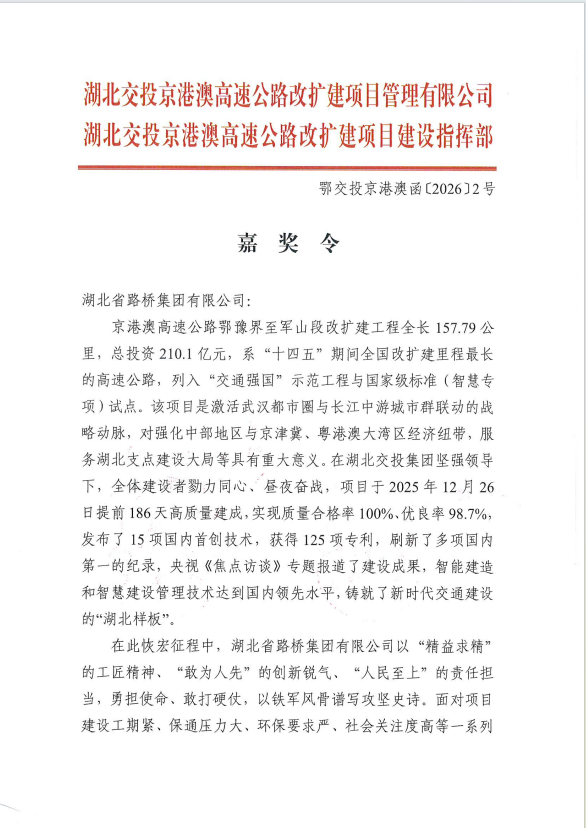 京港澳改擴(kuò)建項(xiàng)目指揮部對湖北路橋京港澳改擴(kuò)建1標(biāo)項(xiàng)目建設(shè)中做出的突出貢獻(xiàn)予以通令嘉獎(jiǎng)。該項(xiàng)目是“十四五”期間全國改擴(kuò)建里程最長的“交通強(qiáng)國”示范工程,對激活武漢都市圈與長江中游城市群聯(lián)動(dòng)的戰(zhàn)略動(dòng)脈,對強(qiáng)化中部地區(qū)與京津冀、粵港澳大灣區(qū)經(jīng)濟(jì)紐帶,服務(wù)湖北支點(diǎn)建設(shè)具有重大意義。項(xiàng)目建設(shè)期間,湖北路橋圓滿出色完成建設(shè)任務(wù),成功鑄就新時(shí)代交通建設(shè)“湖北樣板”。