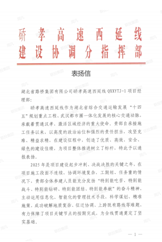 硚孝高速西延線建設(shè)協(xié)調(diào)分指揮部向湖北路橋硚孝高速西延線QXXYTJ-1項(xiàng)目經(jīng)理部發(fā)來表揚(yáng)信,對該項(xiàng)目部在建設(shè)中所取得的突出成績予以高度肯定。
