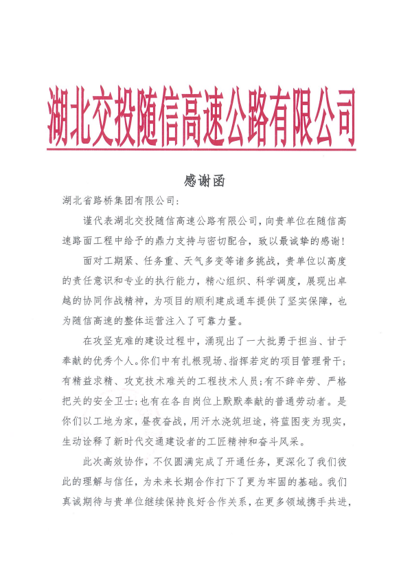 篤行實(shí)干結(jié)碩果,新春傳喜譽(yù)滿途。在2026年新春佳節(jié)來臨之際,湖北路橋相繼收獲來自各協(xié)會(huì)、政府、指揮部、項(xiàng)目辦的感謝信與表揚(yáng)。這份來自各方的認(rèn)可,是對公司深耕基建、匠心筑路的最好回饋,更生動(dòng)詮釋了“筑路架橋、造福社會(huì)”的企業(yè)使命。