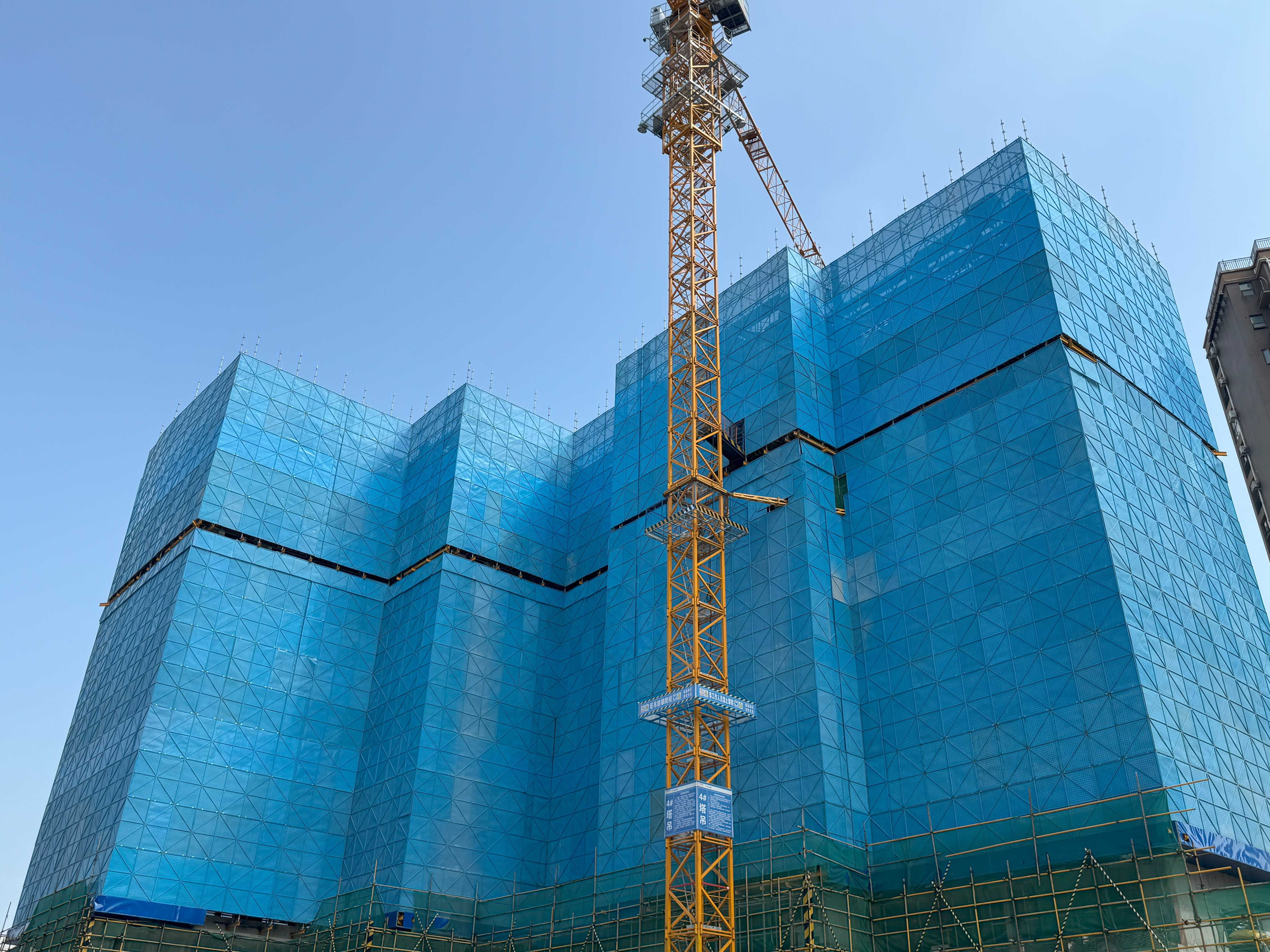 走進施工現(xiàn)場,極目新聞記者看到,在建的5棟高層建筑外立面上采用藍色的花籃懸挑腳手架,既美觀又安全。?