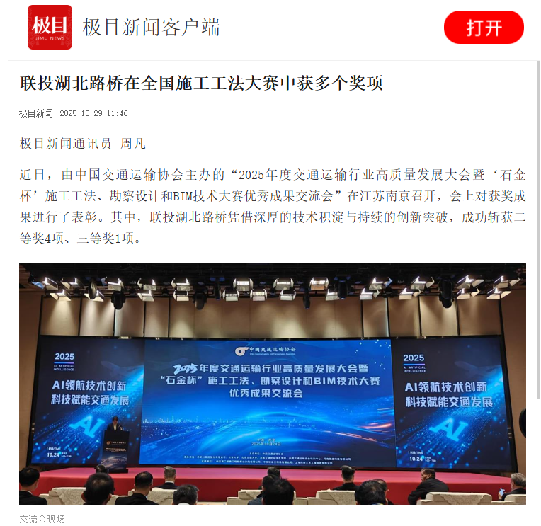近日,由中國交通運輸協(xié)會主辦的“2025年度交通運輸行業(yè)高質(zhì)量發(fā)展大會暨‘石金杯’施工工法、勘察設(shè)計和BIM技術(shù)大賽優(yōu)秀成果交流會”在江蘇南京召開,聯(lián)投湖北路橋榮獲多個獎項,極目新聞對此事件進行報道,以下是報道全文: