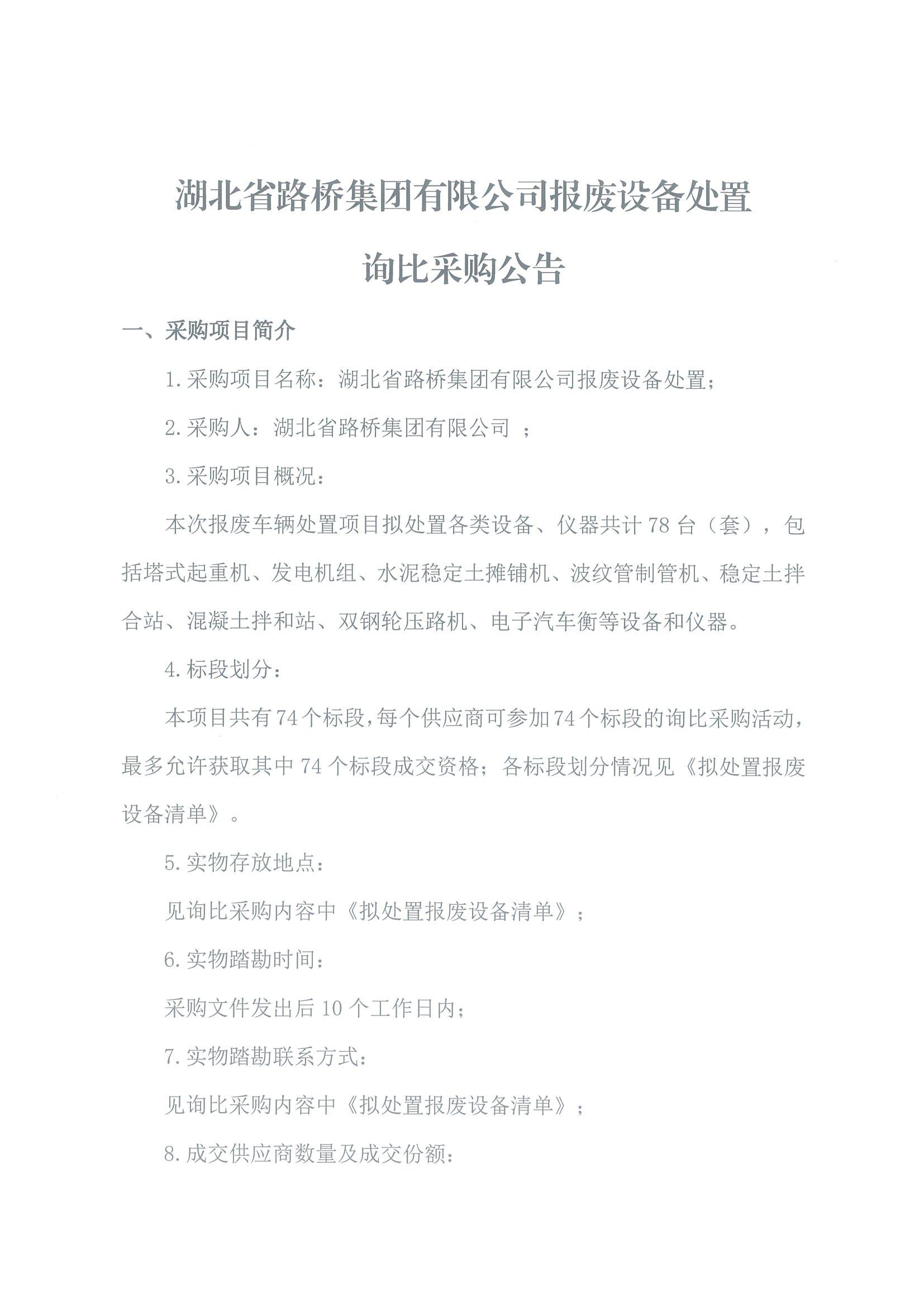 湖北省路橋集團有限公司報廢設(shè)備處置詢比采購公告